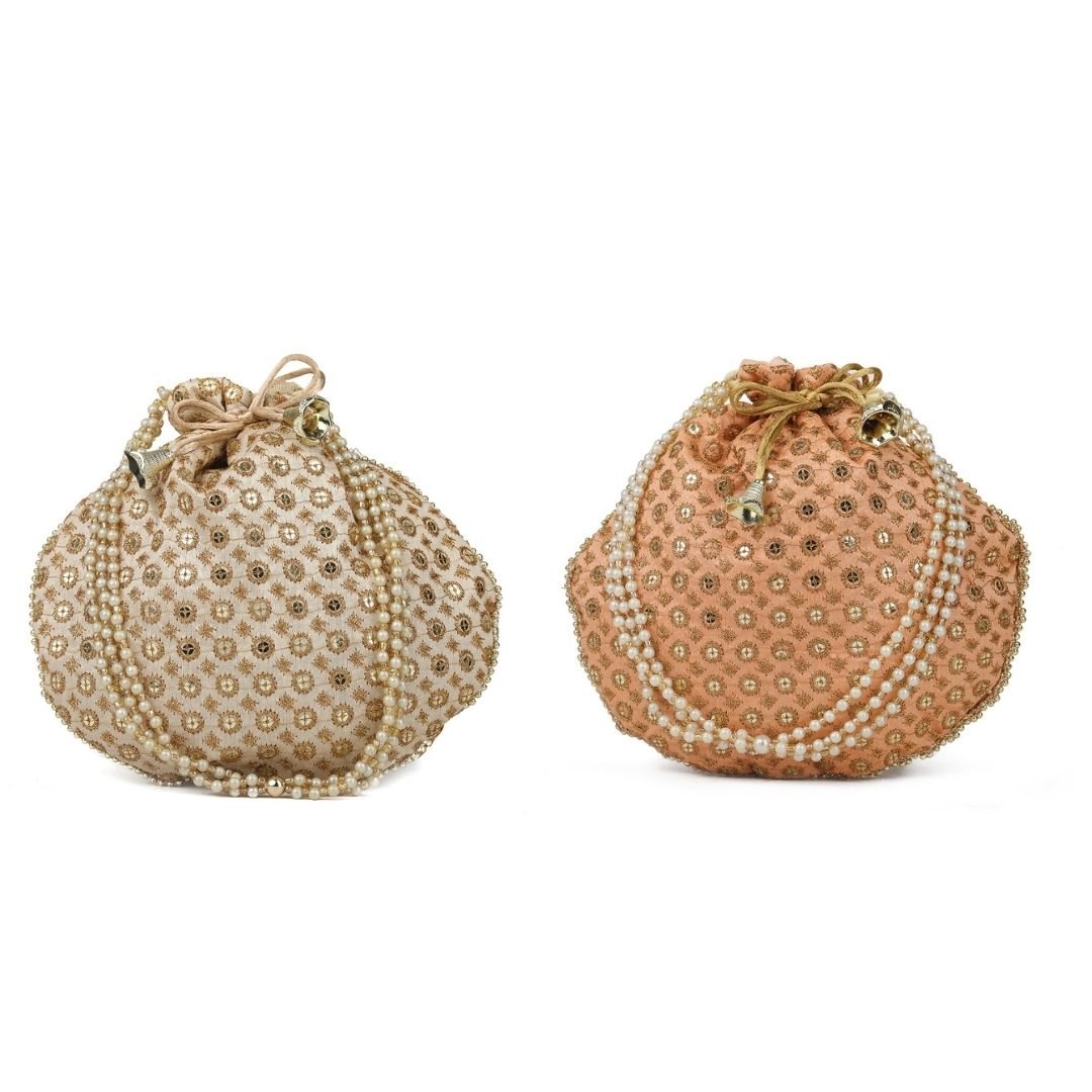 Home W_Bags Potlis PK 2 Combo of Golden & Beige Designer Embroidered Potli Bag