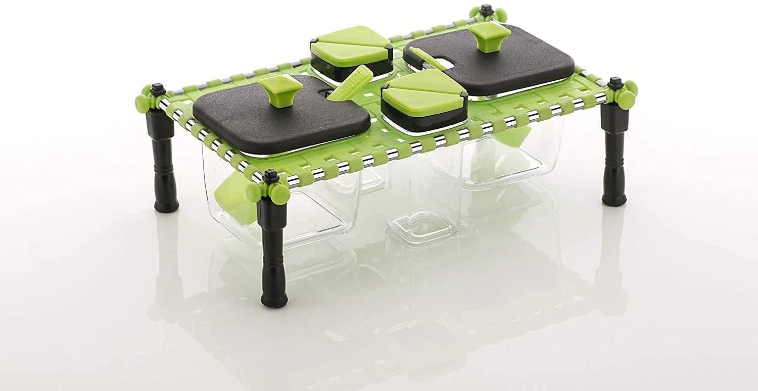 2 In 1 Khatli Style 4 Bottles Multipurpose Revolving Spice Rack Jars & Containers, Khatli Set Spice Jars For Kitchen. Revolving Spice Rack set contains refillable jars which are easy to clean, as they have been made compatible with dishwasher use. *It has 4 spice jars with twistable black lids, which make them easy to open and use. *The containers are transparent with a colored cap. *This ensures that you will easily know when your supplies need to be restocked. *The spice rack is designed with maximum storage capacity occupying minimal space with a very stylish looks. *It is easy to clean and easy to maintain and, therefore, your perfect choice to organize your spice cabinet Storage Containers remains scratch-free and doesn’t get cloudy. *So you can put it in the dishwasher without a worry